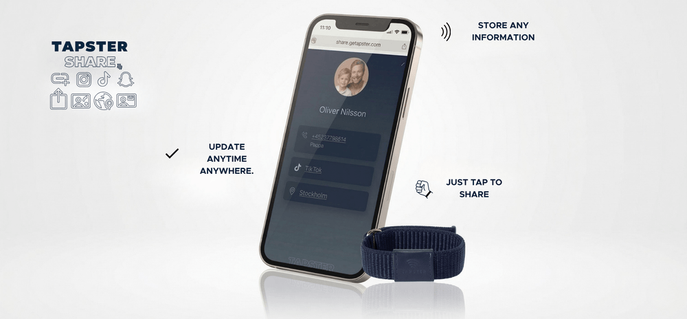 Tapster Share is a feature which adds that extra peace of mind. A TAP on any smartphone can show chosen contact or emergency details, such as who to call or allergies. You decide what’s shared and can update it anytime. No cards to remember and no phone to lose. After a few TAPs, it becomes routine - and everyday life gets easier for both kids and parents.