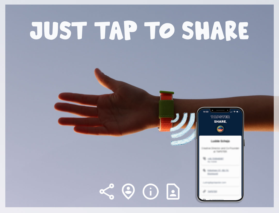 Thanks to the Tapster Share feature, built into the bracelet, sharing your contacts and important information has never been easier. Just bring an NFC-enabled smartphone close to the Tapster logo, on the bracelet, to instantly display your contact details—no batteries or internet connection needed.