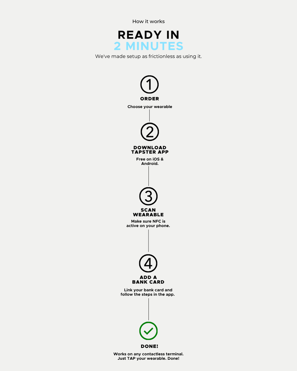 You know how you TAP your bank card or phone to pay at a shop? Tapster puts that exact same technology into beautiful jewellery rings, bracelets, keyrings, watch straps. The chip inside links to your existing bank account. Just hold wearable near any contactless reader and the payment goes through. No battery. No charging. No app open.