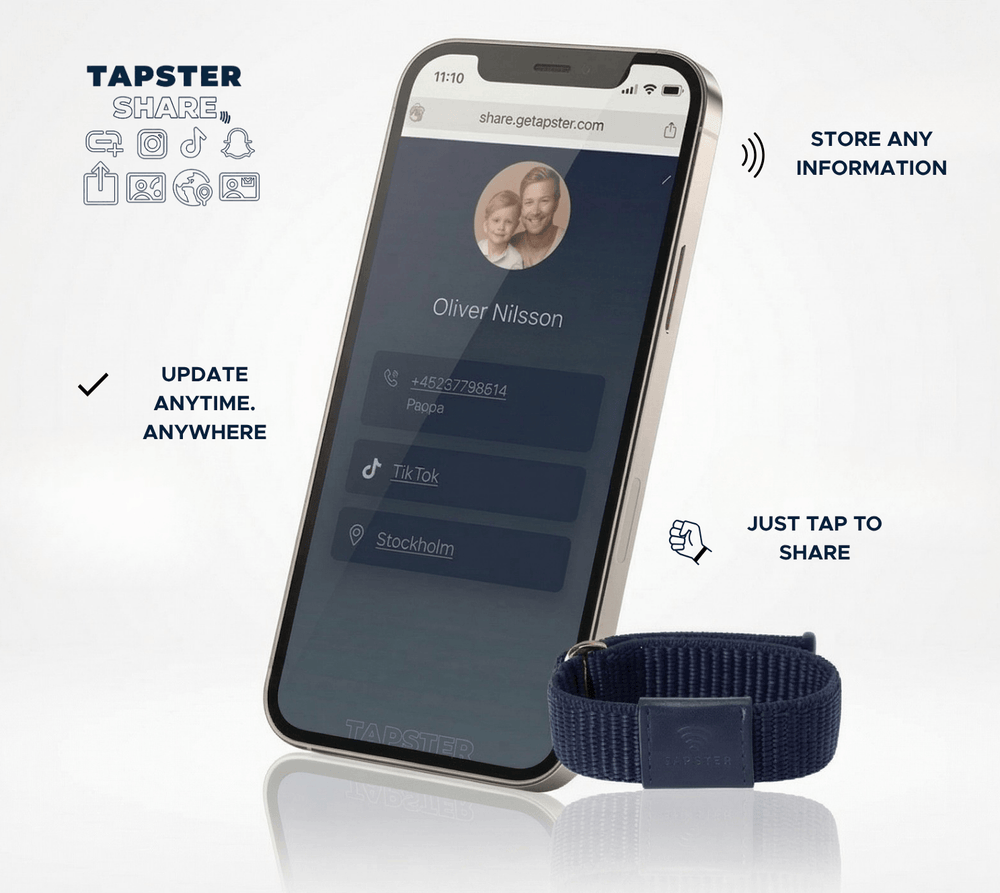 Tapster Share is a feature which adds that extra peace of mind. A TAP on any smartphone can show chosen contact or emergency details, such as who to call or allergies. You decide what’s shared and can update it anytime. No cards to remember and no phone to lose.