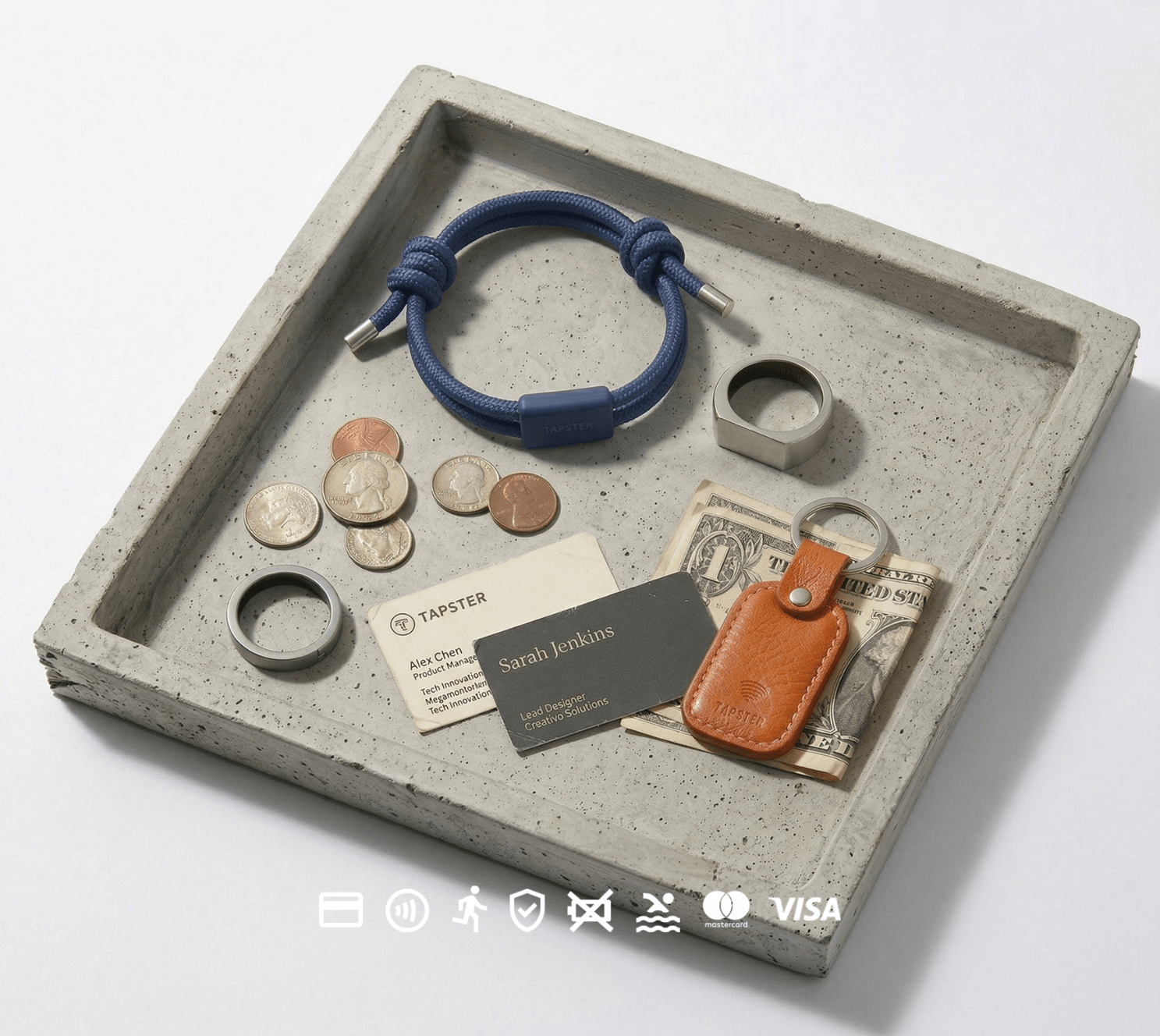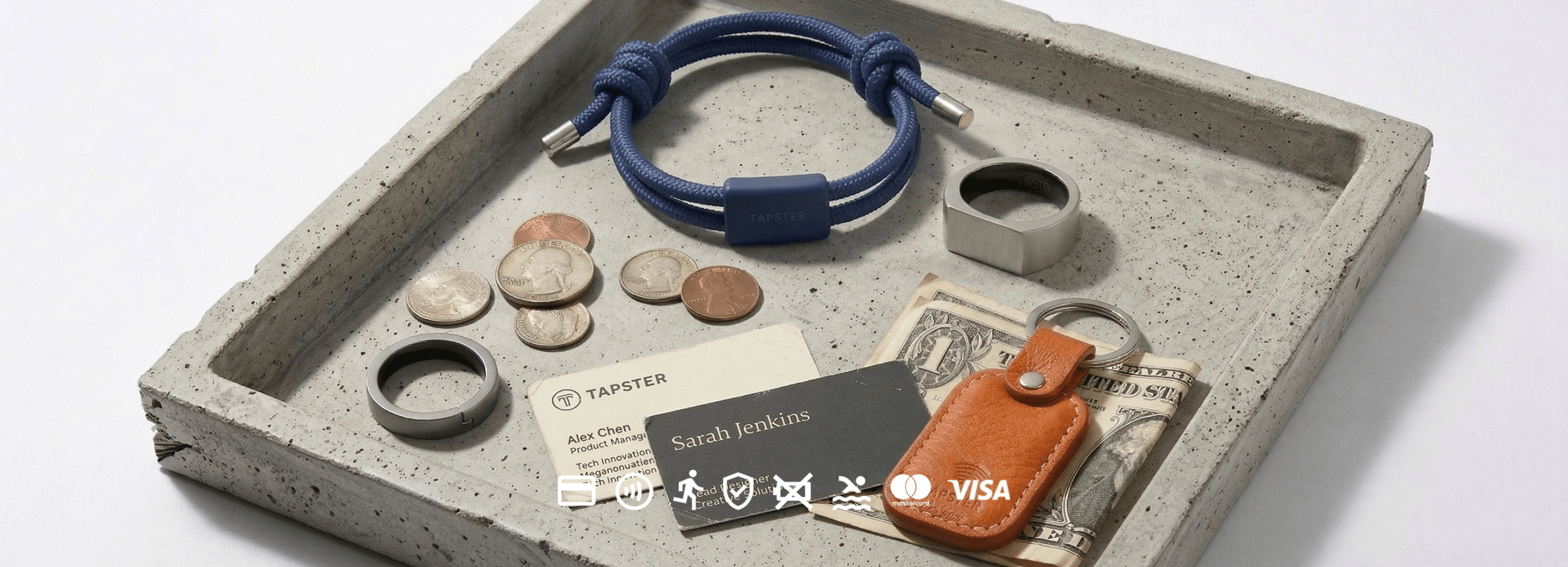 Tapster wearables let you pay with a simple TAP. Rings, bracelets, watch straps and keyrings - choose what fits how you move through your day. All use the same secure NFC technology as your card and phone. Just TAP and you’re done. No wallet. No phone. No batteries.